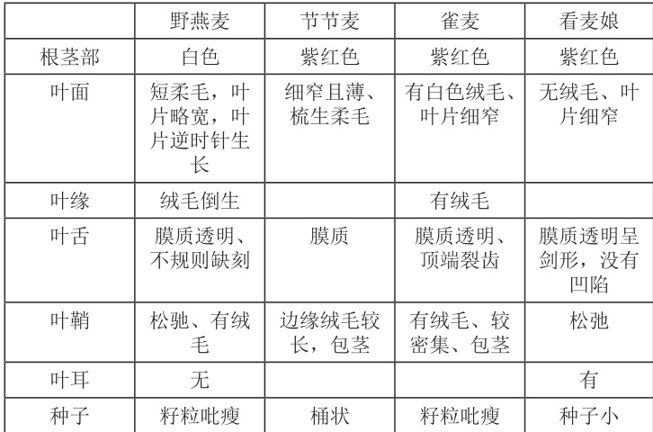 然后再进一步分辨是哪种禾本科杂草。如果根茎部紫红色,叶面有白色绒毛,则可能是雀麦或者节节麦或者看麦娘;挖出一株,若根部有桶状的种子,是节节麦;如果有叶耳则是看麦娘;如果根茎处发白,但表面具柔毛,并且无叶耳,应是野燕麦。详情见下表。