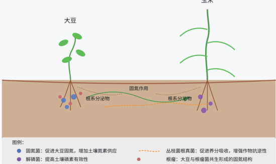 在大豆玉米带状复合种植里,间作套种模式下的作物协同生长技术有着独特生态学意义,尤其体现在根际微生物群落动态变化上,因为大豆和玉米这两种生物学特性不同的作物共同生长时,根系分泌物相互作用明显改变了土壤微生态环境的结构与功能,而且大豆靠固氮能给玉米额外的氮素资源。玉米吸收利用这些资源促进自身生长的同时,其根系分泌物还给土壤微生物提供了丰富碳源,进一步优化微生物群落组成,这种互作关系提升了根际区域微生物多样性,促使固氮菌、解磷菌、丛枝菌根真菌等有益微生物增殖,增强土壤养分循环效率,夯实了作物健康生长的生态基础。如图1 所示。