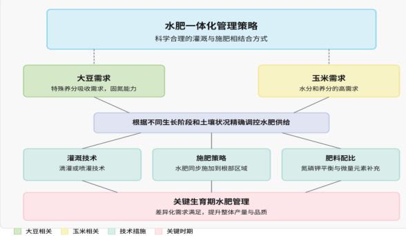 间作套种模式下作物协同生长技术中,大豆玉米带状复合种植里的水肥一体化管理策略极为重要,科学合理地把灌溉和施肥结合起来,不但能满足玉米生长时对水和养分的高需求,还可顾及大豆吸收养分的特殊要求,使两种作物高效共生 [6]。如图 2 所示,具体实施时要依据玉米和大豆不同的生长阶段和土壤实际状况,精准控制水肥供给量与比例,保证资源高效利用。比如在关键生育期用滴灌或者喷灌技术把肥料和水分一起施到作物根部区域,这样可减少肥料浪费,也能防止过量施肥或灌溉带来的环境问题。另外要注意氮磷钾这些主要营养元素的平衡配比并补充足量的微量元素,以满足两种作物不同生长阶段的差异化需求,进而提高整体产量与品质[7]