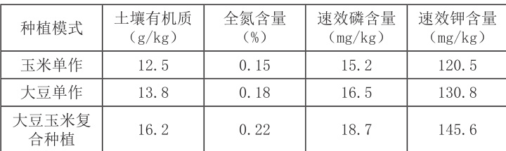 大豆玉米带状复合种植在改善生态环境上有着显著优势,研究显示这种模式能有效地增加土壤有机质含量且与单作模式相比土壤肥力可提高大概 15%,间作模式下作物根系分布存在差异促使土壤养分被均衡利用从而减少化肥施用量以及化肥对环境的潜在污染,大豆的固氮作用给玉米提供部分氮素供应使氮肥使用量进一步降低,下表是不同种植模式对土壤理化性质影响的展示且数据表明复合种植在生态效益方面表现出色。