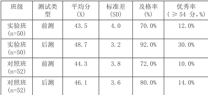 实验班学生写作质量有了显著变化,平均分从实验班作文写作前测平均分43.5 分,提升到后测平均分 48.7 分,提高 5.2 分,提高幅度显著;对照班写作前测平均分 44.3 分,后测为 46.1 分,仅提高 1.8 分,实验班提升幅度明显优于对照班。及格率、优秀率也有显著变化,实验班学生及格率从前测的 70.0%,提升到后测的 92. 0% ;优秀率 (⩾54 分)从前测的 12.0%,提升到后测的 30.0% 。而对照班及格率、优秀率只是分别提升了 8.0% 和 4.0% 。