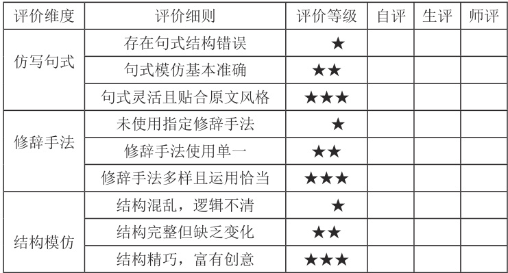 以八下第一单元“学习仿写”教学为例,教师围绕仿写句式、修辞手法运用、结构模仿三个维度设计动态评价量表(如下表 1)。对《社戏》进行片段仿写教学时,教师先给学生发一张量表进行书写,并明确各维度星级评价标准。在写作的过程中,教师会通过巡查来记录一些典型的问题,例如一些学生只是机械地模仿句子结构,而忽视情感的表达,然后将这些问题作为共性问题进行集中指导。完成仿写后,教师对照量表逐项打分,并以批注形式反馈修改建议,如“句式模 仿通顺,却没有纳入个人的观察,提出要加入环境细节描写”。学生根据反馈的信息结合量表的标准二次创作,教师再一次评估比较前后的差别。通过这一动态监测和及时反馈,可以使学生对写作问题进行准确定位,并在不断地纠正中获得仿写技巧,从而达到写作能力螺旋式提高的目的。