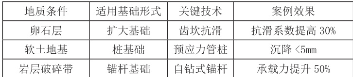 软弱地基采用 ** 桩基础穿越滑移面 **,如软土地基区域浸水挡土墙采用灌注桩或管桩进入持力层。卵石地基则通过** 换填夯实+ 齿坎结构** 增强抗滑力,实测显示齿坎使基底摩擦系数提高0.15。