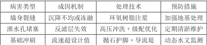 表2 :汛期浸水挡土墙常见病害及处理措施
