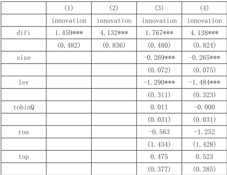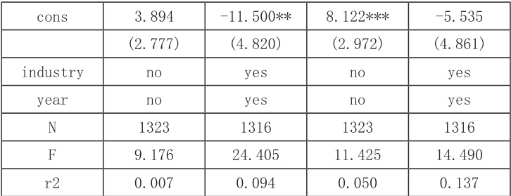 4.3 稳健性分析首先,针对异方差问题可能导致的标准误估计 差假设下的普通最小二乘标准误,以修正可能存在的方差非齐性。列(1)的回归结果显示, 融的边际回归系数为4.131,与基准回归结果高度一致。