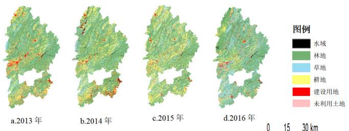 本文从地理空间数据云平台选取湘西贫困山区(除吉首市)2013- 2016 年且云量控制在 12% 以下的遥感影像数据,数据的空间分辨率为 30m*30m ,通过对数据预处理和采用监督分类方法获得 2013- 2016 年四期的土地利用类型遥感图(图1)。
