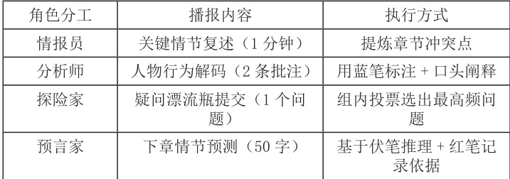 (设计意图:利用游戏化工具具象化阅读目标、关系网络与问题意识,降低整本书的阅读难度;借助色彩符号系统落实分层思考,破解浅层化的阅读困境,提高学生的文本精加工能力;借助角色分工表格明确责任框架,借助轮流主持的方式激发学生的参与感,并借助公约奖惩机制保障连续性。)