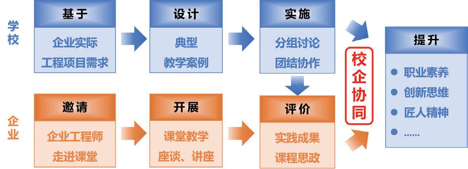 为了实现校企深度协同,如图4所示,首先,专业课教师与企业工程师进行充分交流讨论,将企业真实工程项目需求引入课堂,设计典型实践教学案例,通过学生分组讨论、制定工程实践问题解决方案、分头行动各司其职、实践过程团结协作等环节的实施,使学生在真实的企业需求背景下进行实践活动,在实践中提高自己的职业素养及提出、分析和解决实际工程问题的能力;然后,邀请企业工程师走进课堂,拉近学生与工程问题及工程师的距离。以实际工程项目为背景进行案例式教学,通过开展讲座、参与学生实践环节评价等方式,与专业课教师共同构建校企协同课程思政育人模式,使学生与工程师零距离接触,耳濡目染职业人应具备的创新思维与匠人精神等优秀品质;最后,将企业工程师纳入学生实践环节的评价主体,从实践成果及课程思政两方面对学生进行综合评价。
