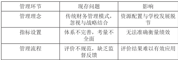 目前,高校财务绩效管理普遍存在一些问题(见表 1)。从管理理念来看,一些高校还停留于传统财务管理模式中,过分强调经费收支平衡而忽略将绩效目标和学校战略规划紧密结合起来。从指标设置上看,指标体系不健全,没有综合考虑教学,科研,社会服务等核心业务,很难准确测度各个部门及项目实际绩效。从管理流程来看,由于绩效评价过程不规范、缺乏有效监督及反馈机制等原因,使得绩效评价结果没有完全用于资源分配及决策制定中[1]。