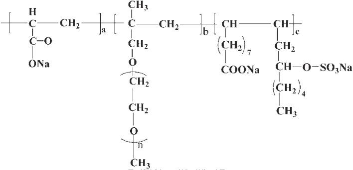 功能型聚羧酸减水剂的分子结构如图1 所示。通过掺加阴离子型表面活性剂蓖麻油磺酸钠代替部分TPEG,从而在减水剂分子结构中引入磺酸基。其中—COONa 基团具有利于提高混凝土流动性,—SO Na 具有增强减水的效果[4]。