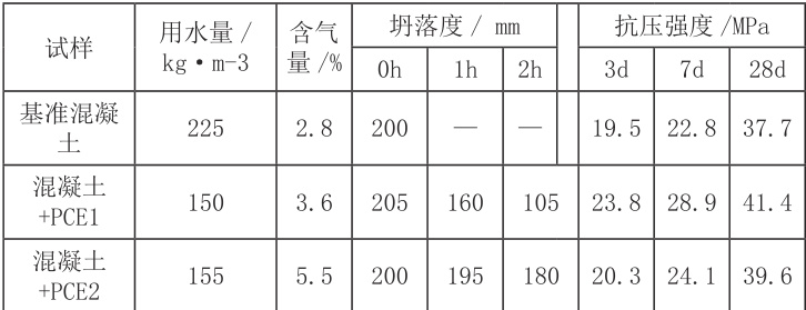 从混凝土试验检测结果可以看出,掺加 PCE 的混凝土拌合物含气量明显较高,硬化混凝土的早期与后期抗压强度低于掺加 PCE 的混凝土试件,但完全满足混凝土的设计强度。此外,掺有 PCE2 的新拌混凝土具有良好的和易性与坍落度保持性能,所以 PCE2 在满足混凝土强度要求的前提下能够引入较多气泡,对于改善混凝土的和易性与坍落度经时损失起到了较大作用。