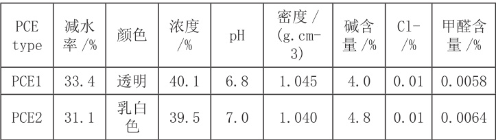 PCE1 与PCE2 两种聚羧酸减水剂的匀质性指标如表1 所示。从检测结果可以看出:两种减水剂氯离子含量很小,不会对钢筋混凝土产生腐蚀作用。甲醛含量极低,不会危害人的健康或造成环境污染。