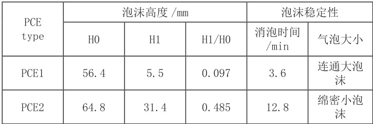 2.5.1 起泡性能测定取浓度为1% 的PCE1 与PCE2 两种减水剂溶液测其起泡性能,具体实验结果如表2 所示。表 2 两种减水剂引气性能对比