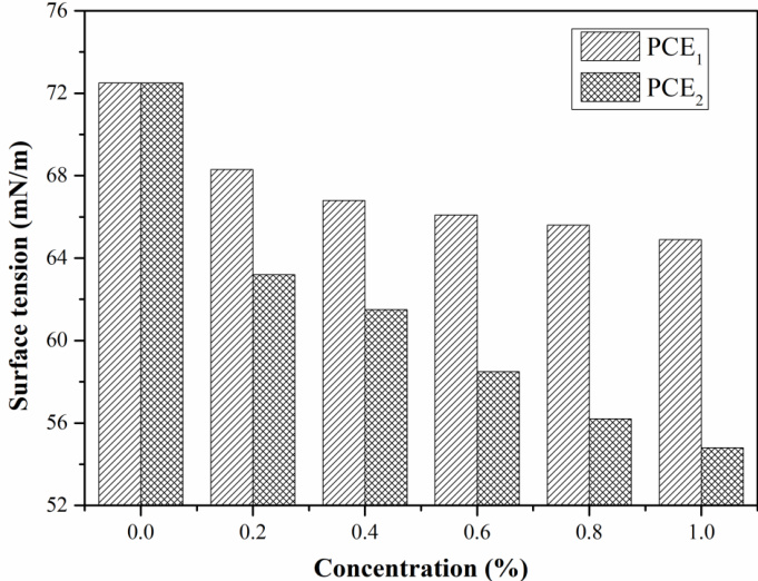 由上图减水剂溶液浓度与表面张力之间的关系可以看出,PCE1 与 PCE2 都能够降低水溶液的表面张力,其中 PCE1 的降低幅度不明显,有 10mN/m 左右,但是 PCE2 对水溶液表面张力的影响比较显著,当浓度在 1% 时,水溶液的表面张力下降了 15mN/m。这表明 PCE2 型聚羧减水剂引气效果较好。
