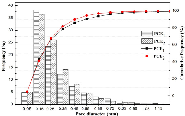 利用 Image-Pro plus 图像软件对硬化混凝土的孔结构特征进行分析处理,其表面的二值化图像与孔径分布规律如图 6 和图 7 所示。从图 6 可以直观的看出,掺加 PCE2 的硬化混凝土表面的大孔隙明显较少。由图 7 中的柱状分布频率图可知,掺加 PCE2 时硬化混凝土表面孔径小于 0.55mm 的孔相对较多,而掺加 PCE1 时孔径大于 0.55mm 的孔相对较多。图 7 中分布累积频率折线图可以看出,在相同分布累积频率时,掺加 PCE 硬化混凝土表面孔的孔径更小。综合以上结论得出,掺加 PCE 硬化混凝土表面出现的主要是孔径小于 0.55mm 的孔,易于填充和修复,所以掺加PCE2 减少了了硬化混凝土表面的大孔径气孔数量。