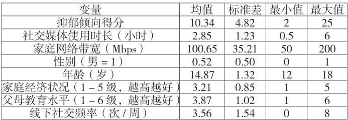 其中,Depression 表示青少年的抑郁倾向得分,SMU 为社交媒体使用时长,Controlsk 为一系列控制变量, ∝0 为常数项,α1 为社交媒体使用时长对抑郁倾向的影响系数, αk 为各控制变量的系数,μ 为随机扰动项。