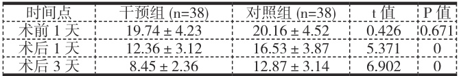 两组患者术前 1 天焦虑评分差异无统计学意义( P>0.05 );干预组患者在术后 1 天和术后 3 天的焦虑评分均显著低于对照组( P<0.05 )。详见表1。