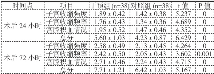 干预组患者在术后 24 小时和 72 小时的子宫收缩功能评分均显著高于对照组( P<0.05 )。详见表2。