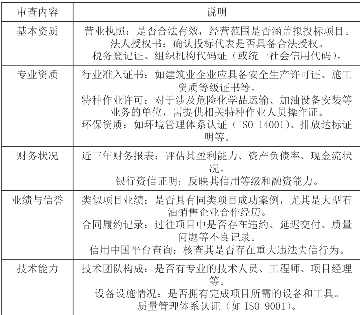 在石油销售企业的招标过程中,注重投标人的资质审查是确保项目质量、降低风险、提高招标成功率的关键环节。通过科学、严谨的资质审查机制,可以有效筛选出具备履约能力、技术实力和良好信誉的投标人,从而为项目的顺利实施打下坚实基础 [3]。资质审查的主要内容如下表2 所示。