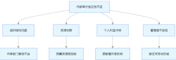 (二)内部审计独立性不足的原因。内部审计独立性不足的原因在于组织结构有问题、存在资源依赖、个人利益冲突以及管理层不重视等。内审部门未能独立于被审计的部门,可能隶属于财务或运营部门,从而影响其独立性。审计部门负责人的报告关系不明确或直接向可能影响审计判断的管理层报告。内部审计部门的预算和资源由被审计的部门控制,这可能导致审计工作受到限制或影响。审计人员的薪酬和晋升可能受到被审计部门的影响。管理层可能不重视内部审计的作用,导致审计部门缺乏必要的支持和权威。(图2)