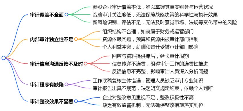 (一)审计覆盖不全面:国有企业的内部审计在覆盖范围上存在不足,尤其是对参股企业的审计覆盖不够,以及对战略审计的重视程度较低。也未能识别新的或变化的风险,比如市场变化、法规变动或业务模式变化带来的风险,同时对已知风险的评估不充分,没有将其纳入审计重点。