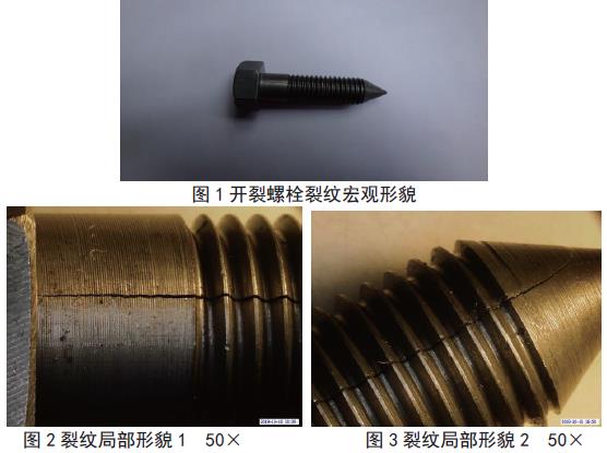 开裂螺栓宏观形貌如图 1,用三维视频显微镜观察,螺栓裂纹局部放大形貌如图 2、图 3,大部分螺栓裂纹均沿纵向贯穿螺杆,一端止于螺栓头部,另一端止于螺栓尾部,少部分螺栓裂纹未贯穿螺杆。
