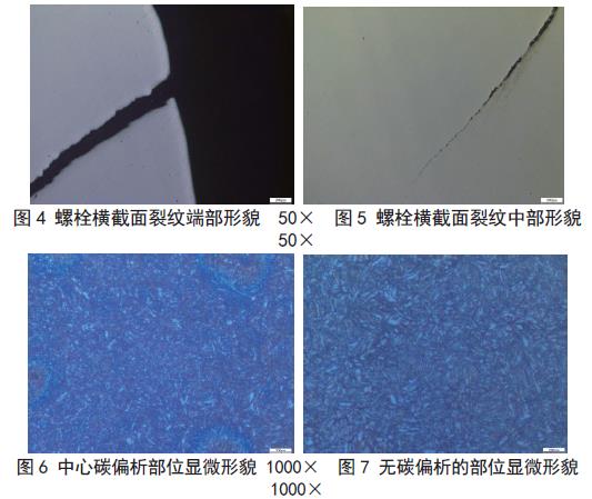 对开裂螺栓取样进行显微组织检查,裂纹形貌如图 4、图 5,可见裂纹由外表向心部扩展,尾部尖细,为淬火裂纹形貌,裂纹周围无非金属夹杂物等原材料缺陷。试样经浸蚀后观察发现,材料中心部位存在碳偏析现象,显微组织为回火索氏体 + 铁素体 + 碳化物(图6);其它不存在碳偏析的部位显微组织为回火索氏体 + 铁素体(图 7)。对比可知,碳偏析的部位,除存在碳化物外(小亮点状组织),铁素体含量较无偏析的部位少(白色块状或针状组织)。