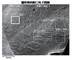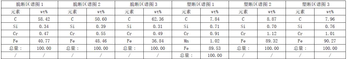 对开裂螺栓裂纹部位制作横向断口,用扫描电镜观察,发现断口存在脆性断裂和塑性断裂两种形貌,用 X 射线能谱仪进行分析,可见脆性断裂区的碳含量明显高于塑性断裂区,详见如下能谱分析报告。