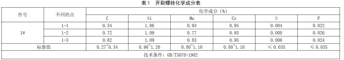 随机抽取 1 件开裂螺栓,在螺帽处进行化学成分分析,打 3 个点,结果如下表,可见不同位置碳含量差异较大,个别点 C 含量高达 0.72% ,远远超出标准值,说明材料成分不均匀,存在严重的碳偏析现象。