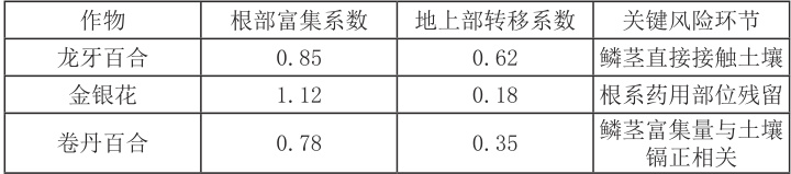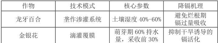 实施效果:2024 年干旱条件下,垄作渗灌的百合鳞茎镉含量控制在 0.15 mg/kg 以下,滴灌覆膜使金银花根系层有效镉含量降低 28% ,节水率达 40% 。