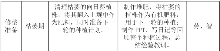 “葵园”课程意在突出对学生劳动实践能力以及乐观向上心态的培养,课程根据向日葵的生长周期和自然规律,可以划分为“播种萌芽”“茁壮成长”“成熟丰收”及“休整准备”四个阶段。这些阶段以劳动教育为纽带,串联起德育、智育、体育、美育,涵盖了一系列连贯且丰富的劳动教育课程内容。