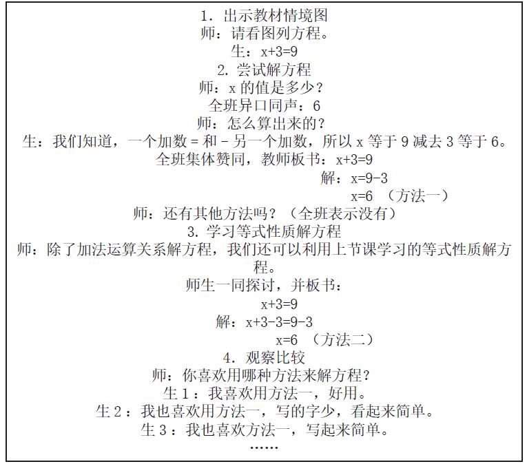 通过这两轮的教学实践发现,以等式性质为依据,能够促进学生同时考虑等号的两边,从整体上理解方程的含义。这就有利于学生理解方程所揭示的等量关系,构建方程模型,感悟方程的本质、方程的思想。