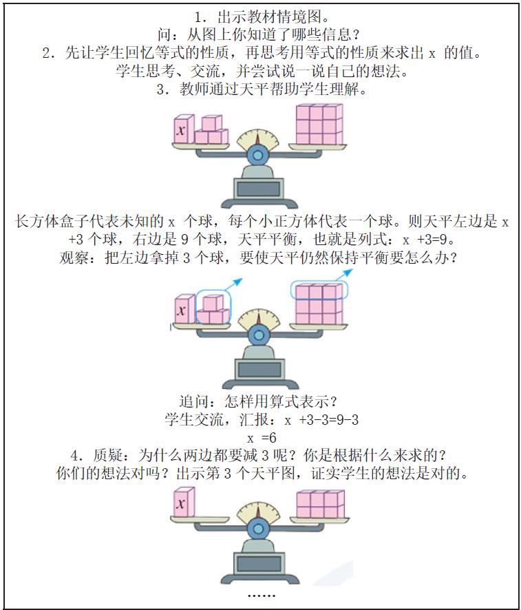 首先,意识到先入为主思想的影响之大,必须留好解方程方法的第一印象。因此,在课堂导入上,教师必须体现出学习的引导者,引导学生充分联系等式的性质和平衡的天平,尽量避免用四则运算关系来解方程。