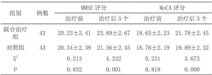 治疗前,两组患者 MMSE、 MoCA 评分差异无统计学意义( P>0.05 )。治疗后3 个月联合治疗组MMSE、 MoCA 评分均显著高于对照组( P<0.05) )。见表1 :