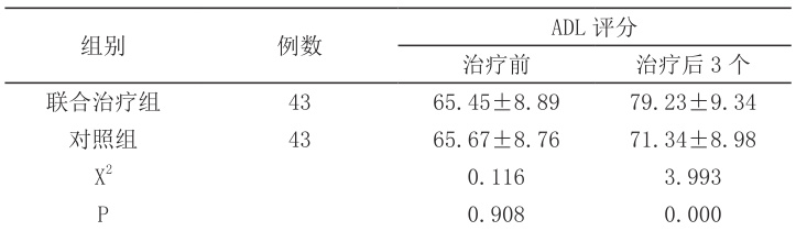治疗前,两组患者 ADL 评分差异无统计学意义( P>0.05 )。治疗后 3 个月联合治疗组ADL 评分显著高于对照组( P<0.05 ),见表 2