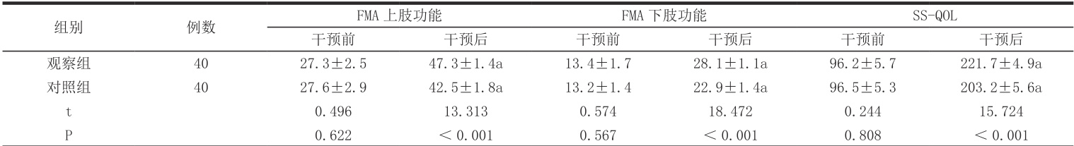 观察组干预后运动功能及生活质量评分高于对照组(P < 0.05)。详见表2。