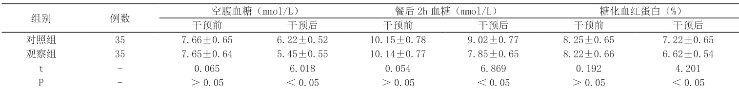 如表 2,两组三项指标干预前对比无统计学意义( P>0.05 ),干预后,观察组的空腹血糖、餐后 2h 血糖、糖化血红蛋白水平均低于对照组,差异对比存在统计学意义( P>0.05 )。