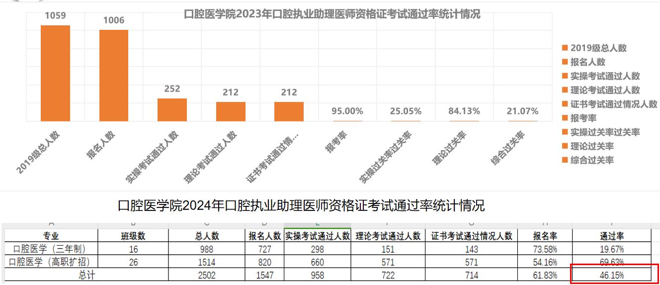(3)学生岗位胜任力提升:通过优化课程设置和强化实践教学,学生的岗位胜任力得到了显著提(4)2024 年相较于2023 年,口腔执业助理医师通过率提高了25.07 个百分点(详见下图)。