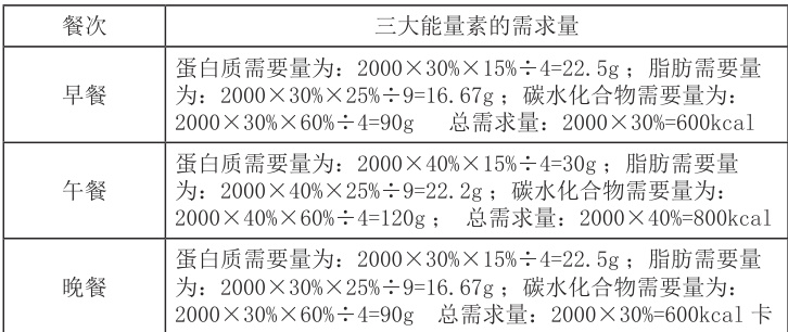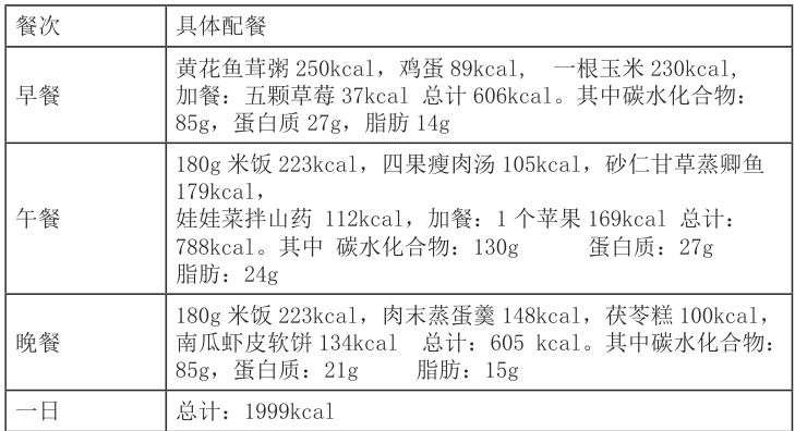 分析:通过望、闻、问、切,中医辨证此证属脾虚湿困,治以补气健脾,利水消肿,周女士的 BMI 指数为 68÷1.62÷1.62≈25.91>24.9 体型超重,而根据《中国居民膳食营养素参考摄入量(2013 版)》,我国成年人中身体活动水平者能量需要量男性为 10.67MJ( 2550kcal) ),女性为 8.79MJ(2100kcal) )。因此,作者在居民正常营养摄入量的基础上为周女士减少了 100kcal ,周女士一天的营养摄入量应为 2000kcal⨀ 。