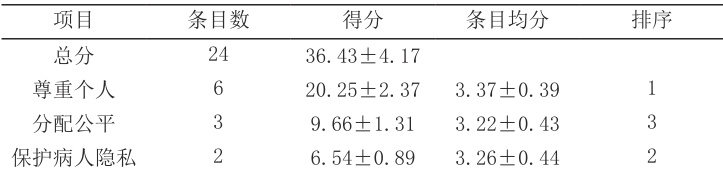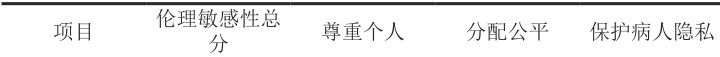 该量表由由日本学者MURAMATSU 等[10] 研发,经王胜男等[11] 人汉化翻译成中文版本,涵盖了尊重个人(包含6 个条目)、公平分配(包含3 个条目)以及保护病人隐私(包含2 个条目)三个方面,总共包括11 个条目。评分使用 Likert 四级量表(1 分表示完全不同意,4 分表示非常同意),总分范围在 11 到 44 分之间,得分越高表示护理学生的伦理敏感性越高。量表的总体 Cronbach’s α 系数为 0.96,各个方面的 Cronbach’s α 系数分别为 0.880、0.931 和 0.803。