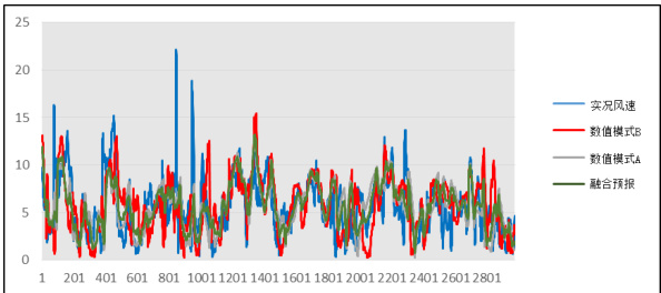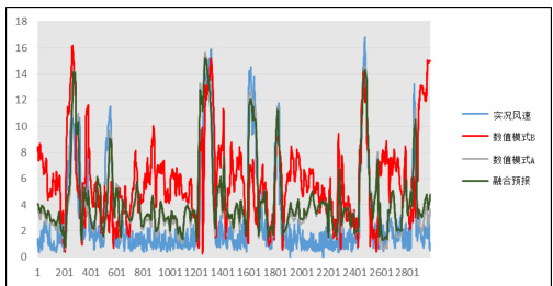 对比分析可得出以下结论及思考:A 风电场 1 月、7 月由于数值预报源特征明显,融合预报效果不理想;H 风电场 1、和 8 月融合预报均有所改善,均方根误差较数值模式 A 分别降低 0.13m/s 和 0.12m/s ;较数值模式B 分别降低 0.75m/s 和 0.67m/s ,预报效果有一定改善。