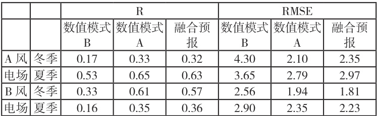 利用均方根误差(RMSE)和相关系数 (R) 对预报数据进行检验分析。1 月 A 风电场模式 A 误差 2.1m/s ,显著优于模式 B 的 4.3m/s ,融合结果接近模式 A 7 月A 风电场两模式常同向偏差,模式A 误差 2.79m/s ,模式 B 为 3.65m/s ,融合后为 2.97m/s ,改进有限。H 风电场 1 月模式 B误差 2.56m/s ,融合后较B 降低 0.75m/s ,较A 降低 0.13m/s ,达 1.81m/s 7 月融合效果提升:较 A,相关系数提高 0.01,误差降 0.12m/s ;较 B,相关系数提高0.2,误差降 0.67m/s ,整体有所优化。