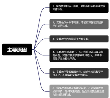 国内认证专业逐年攀升,以方案制定和教学改革为主的 OBE 理念在人才培养中得到广泛接受和应用。而以实验室和实践基地建设为主要研究内容的 OBE 在实践教学中的实施研究较少。这些措施对实践教学中暴露出来的学生动手能力不足、缺乏对现场工艺、工程等方面的深刻认识等问题,还不能有效解决。由于实践教学目标不明确,实践教学体系不健全,实践教学内容滞后于发展实际等原因,经过深入分析,如图2 所示:[4]