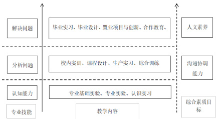 专业人才认证实践教学包括教学内容传授、专业能力提升、综合素质培养三个方面的内容,是专业人才认证实践教学的主要内容。三个方面层层递进,综合素质的培养依托于教学内容和专业能力,专业能力和教学内容的相互支撑更好的服务于专业认证人才的培养。如图 3、实际教学内容与安全工程专业教学目标之间的关系。