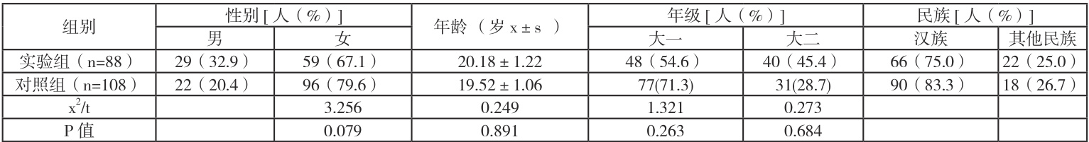 实验组和对照组学生在性别、年龄、年级、民族构成方面,P 值均大于0.05,不存在显著差异。详见表 1 。