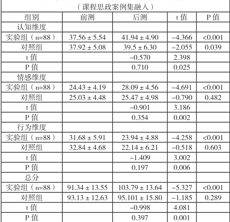 实验前测数据显示,实验组与对照组学生在专业认同感总分及各维度得分上均无统计学差异( P>0.05 )。经过一学期的干预后,实验组学生的专业认同感总分及各维度得分均显著优于对照组( P<0.005 )。纵向比较发现,实验组学生后测的专业认同感各维度及总分较前测均有显著提升( P<0.005 ),而对照组仅认知维度呈现显著变化( P<0.05 ),其余维度及总分前后测差异均无统计学意义( P>0.05 )。详见表 2