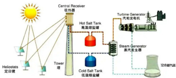 两套循环系统其主要光热发电设备有吸热系统、聚光系统、蒸汽发生器系统、直接空冷系统、发电设备系统、盐泵设备、盐罐设备、熔盐管道、熔盐阀门、熔盐、管道电伴热、电气系统等设备组成。