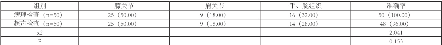 在制定相应的治疗方案后,医生便会对不同患者实施针对性的治疗,为明确患者的治疗效果,医生会使用超声对患者实施检查评估,能够获得较为清晰的检查图像,便于医生进行解读。通过结果可知,病理检查与超声检查结果的准确率无显著差异( P>0.05⟩ ),且治疗后的关节囊厚度明显变薄,疼痛程度评分明显降低,关节功能改善评分明显提升,比较治疗前存在显著差异, P<0.05 ,说明超声检查技术能够对患者的疾病类型较为准确的诊断,且能够明确治疗前后的指标变化。