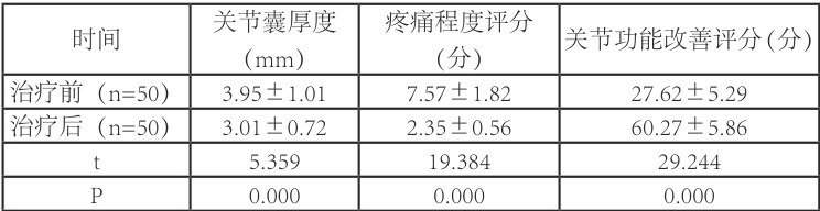 治疗后的关节囊厚度变薄,疼痛程度评分明显降低,关节功能改善评分明显提升,比较治疗前存在显著差异, P<0.05 ,见表2。
