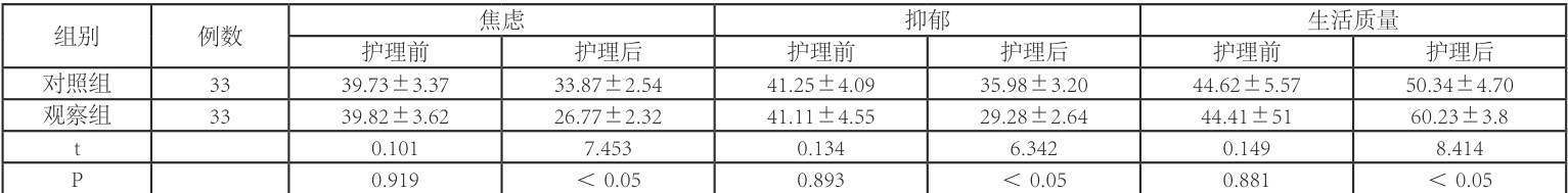 两组护理前焦虑抑郁情绪、生活质量( P>0.05 );观察组护理后优于对照组( P<0.05 )。见表1。